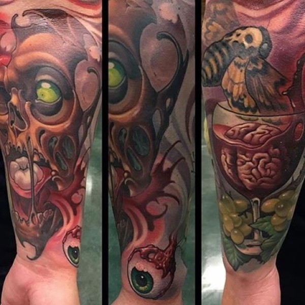 小臂有趣的彩绘骷髅人脑眼球纹身图案