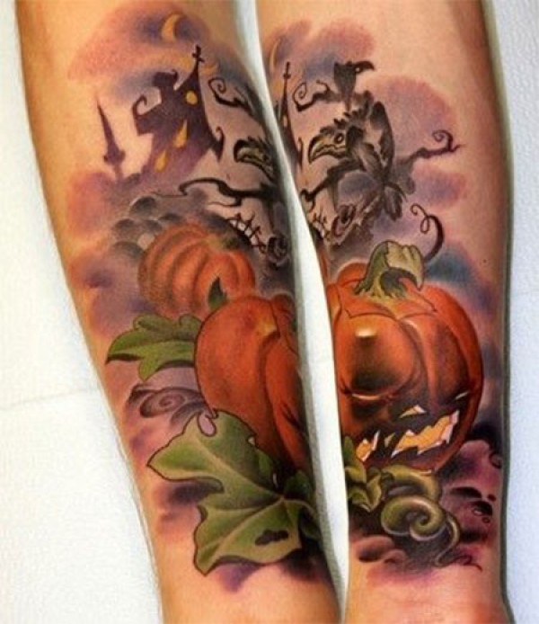 精致的彩色万圣节南瓜与老房子和乌鸦纹身图案
