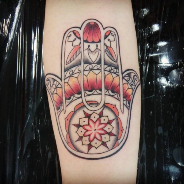 小臂彩色的法蒂玛之手符号纹身图案