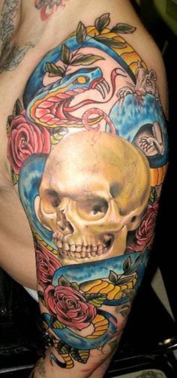 大臂old school彩色骷髅与蛇和老鼠纹身图案
