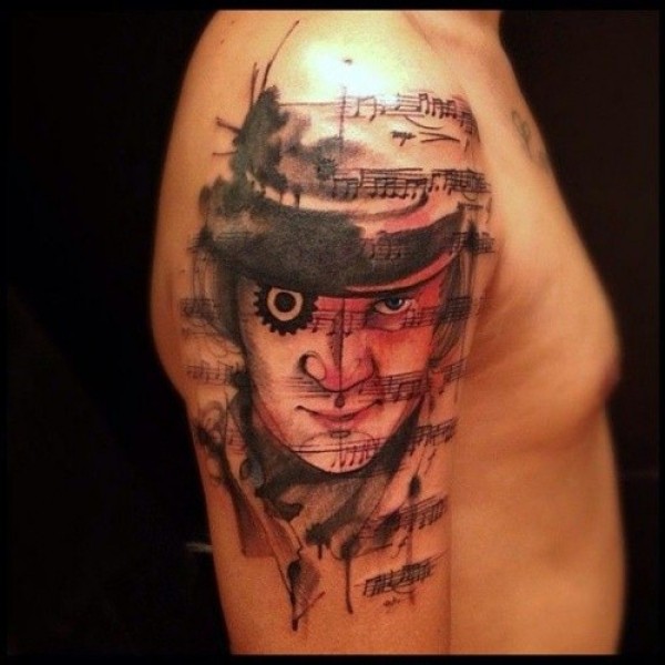 大臂男子肖像与音符乐谱纹身图案