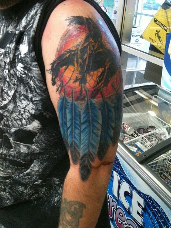大臂有趣的彩色印度马骑士与捕梦网纹身图案