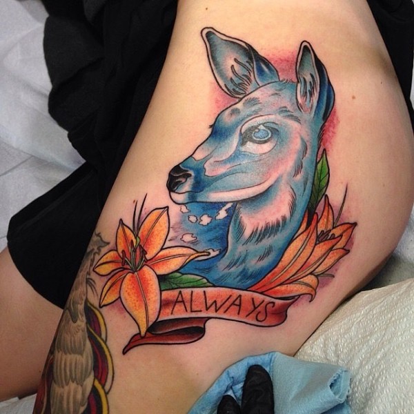 大腿五彩缤纷的花朵和小鹿纹身图案