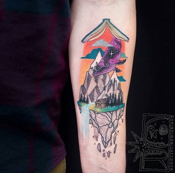小臂彩绘鲸鱼和山脉魔法书纹身图案