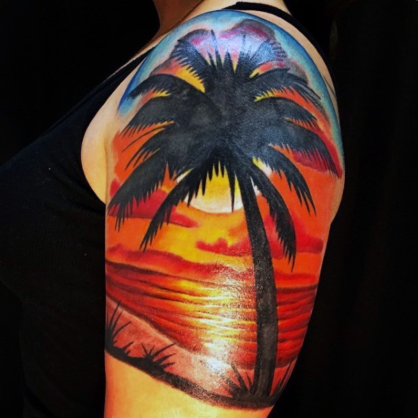 大臂彩绘浪漫海洋日落与棕榈树纹身图案