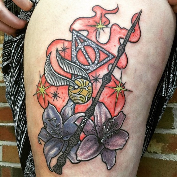 大腿哈利波特为主题的魔术棒和花朵纹身图案