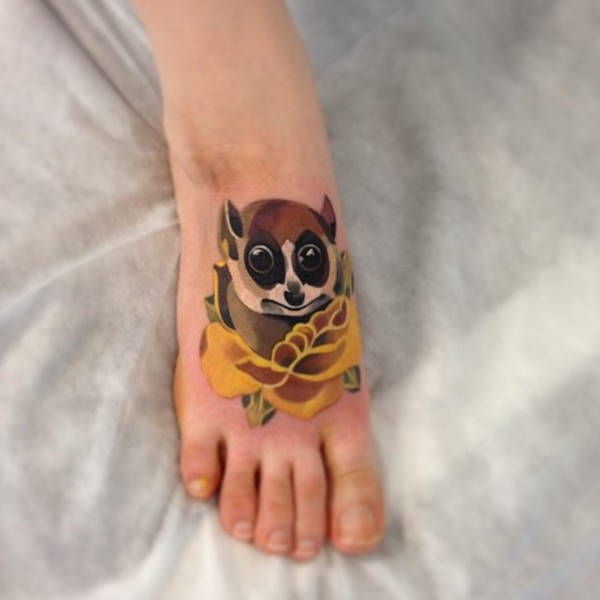 脚背可爱多彩的狐猴和黄玫瑰纹身图案