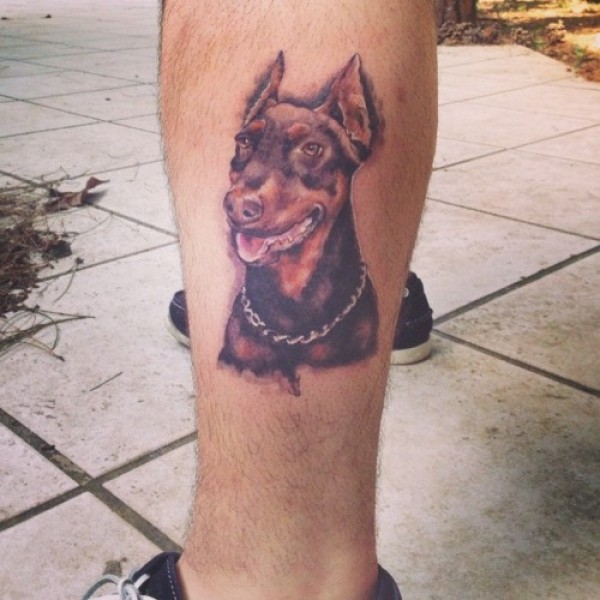 小腿彩色杜宾犬肖像纹身图案