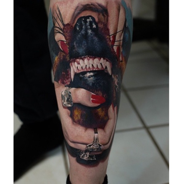小腿写实逼真的狗狗牙齿和人手纹身图案