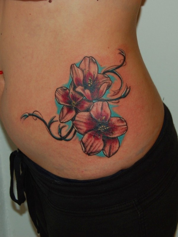 侧肋可爱多姿多彩的异国花卉纹身图案