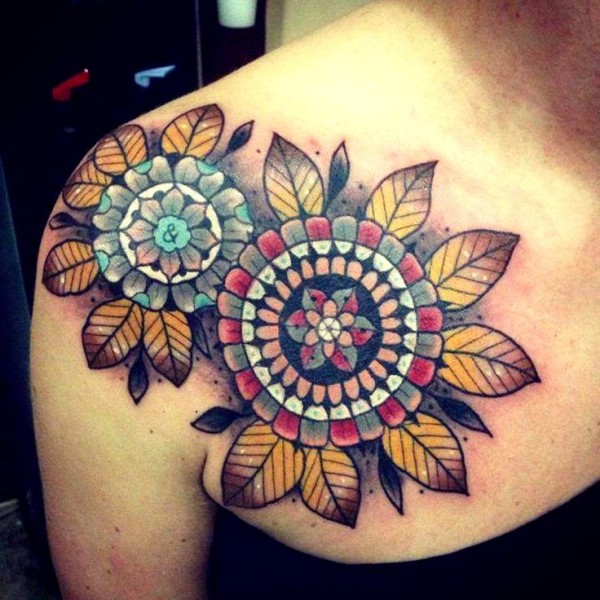 肩部有趣的old school曼陀罗花与叶子纹身图案