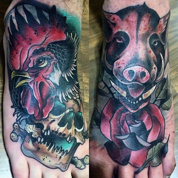 脚背公鸡头部与野猪和骷髅纹身图案