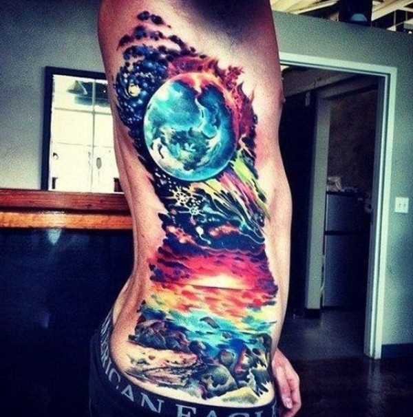 侧肋奇妙的彩色星空风景纹身图案