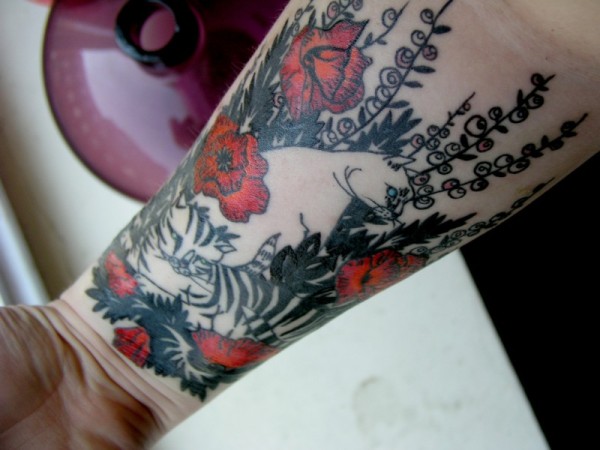 小臂有趣的彩色猫在罂粟花里纹身图案