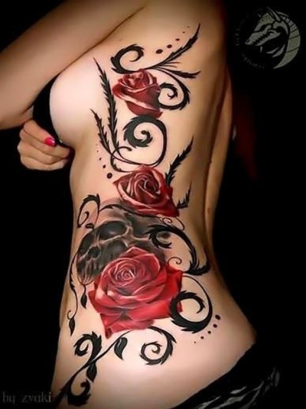 侧肋彩色写实红玫瑰与骷髅纹身图案