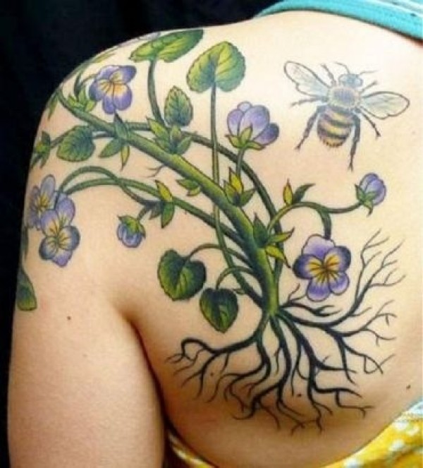 背部彩色花朵和蜜蜂纹身图案