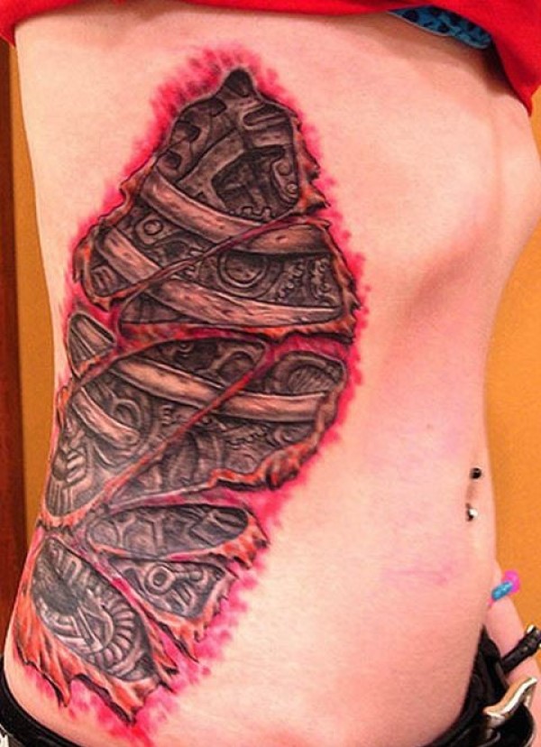 侧肋彩绘机械和骨骼下皮肤撕裂纹身图案
