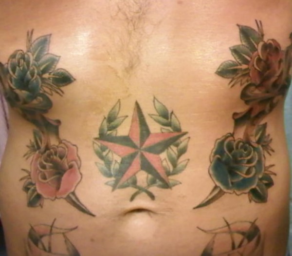腹部胸部五颜六色的玫瑰五角星纹身图案