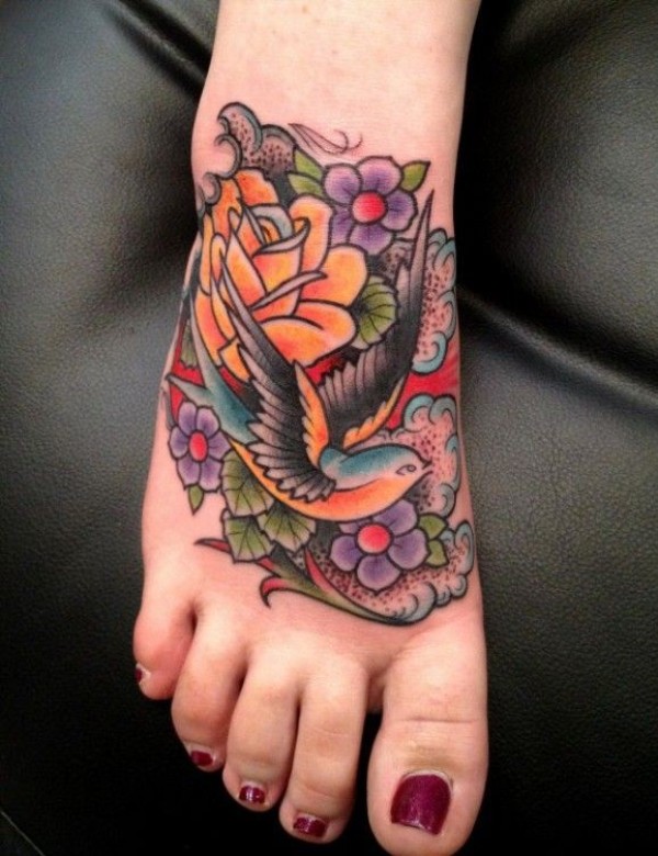 脚背old school彩绘燕子花朵纹身图案