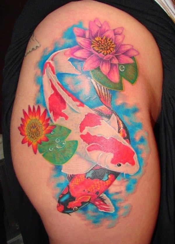 五颜六色的锦鲤鱼游在池塘纹身图案