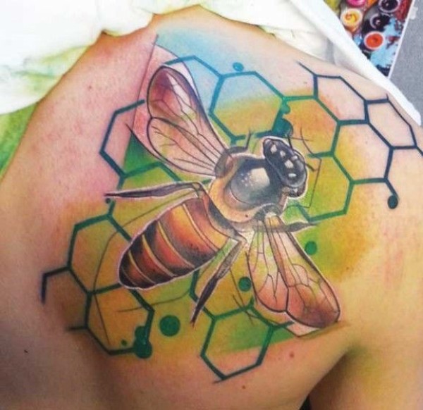 肩部丰富多彩的蜜蜂和蜂窝纹身图案