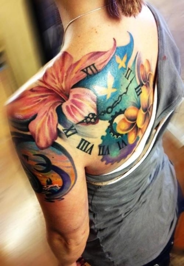 背部彩绘芙蓉花和时钟纹身图案
