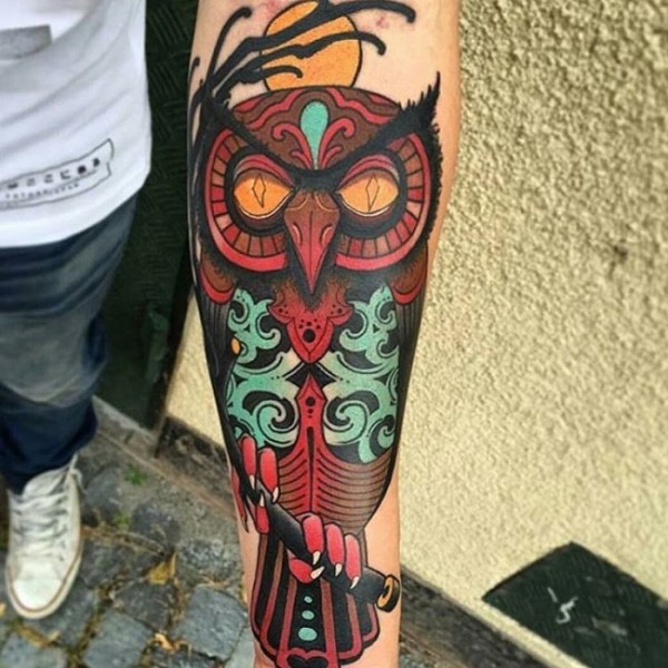 小臂彩色部落风色彩猫头鹰纹身图案