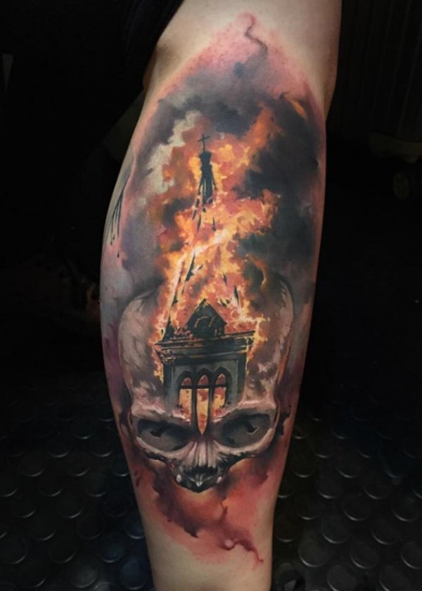小腿彩色燃烧的建筑物与骷髅纹身图案