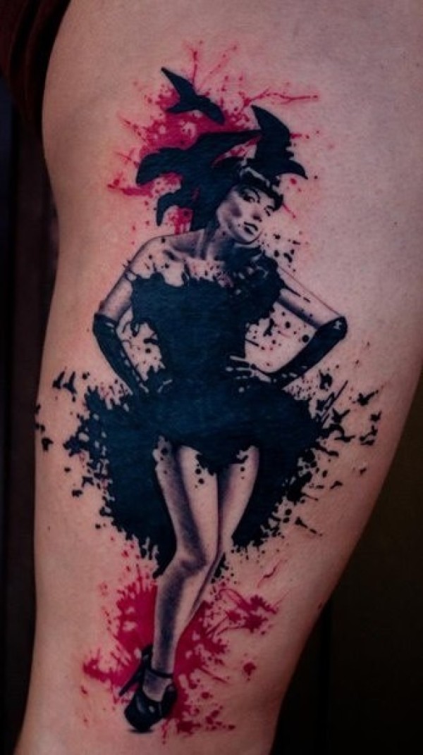 水墨风格彩色女人与乌鸦纹身图案