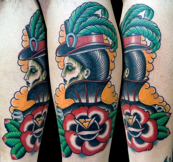 old school彩色帽子和玫瑰女人纹身图案