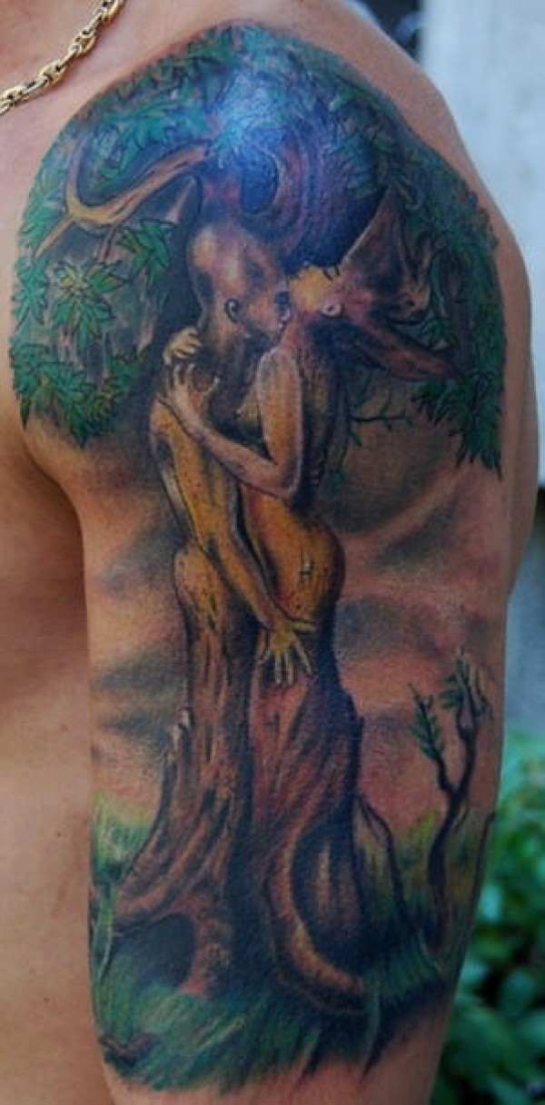 手臂彩绘男女人像树纹身图案