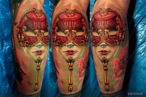 现实主义风格的彩色面具与鲜花纹身图案