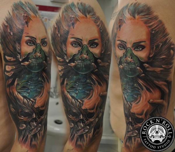 彩色毛骨悚然骷髅女人纹身图案