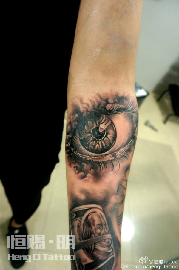 有意思的小纹身,黑灰写实风格眼睛和美钞~