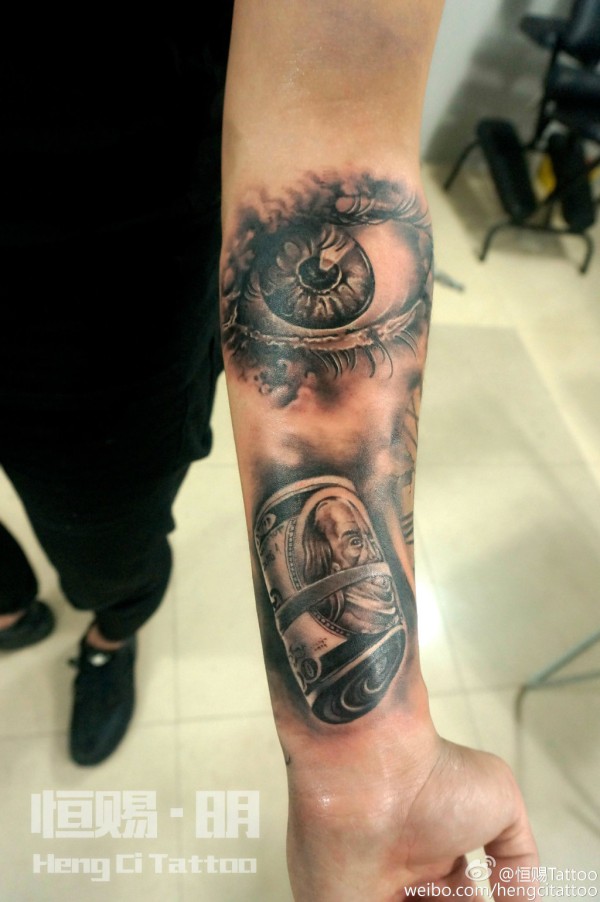 有意思的小纹身,黑灰写实风格眼睛和美钞~