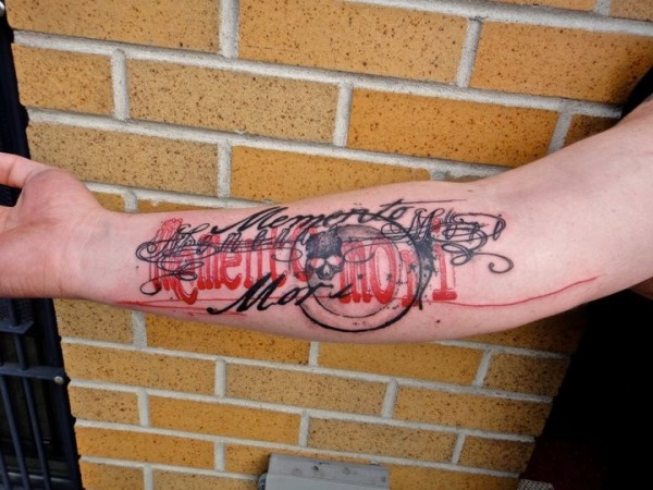 手臂彩色骷髅与夸张的花体字母纹身图案