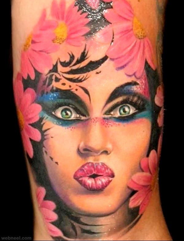 小臂彩绘幻想女人肖像和逼真花朵纹身图案