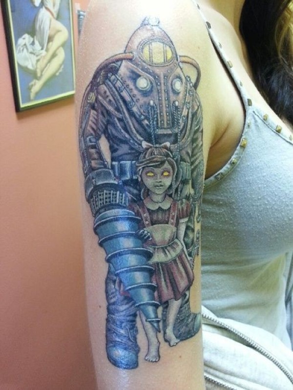 女生手臂彩色神秘机器人与小女孩纹身图案