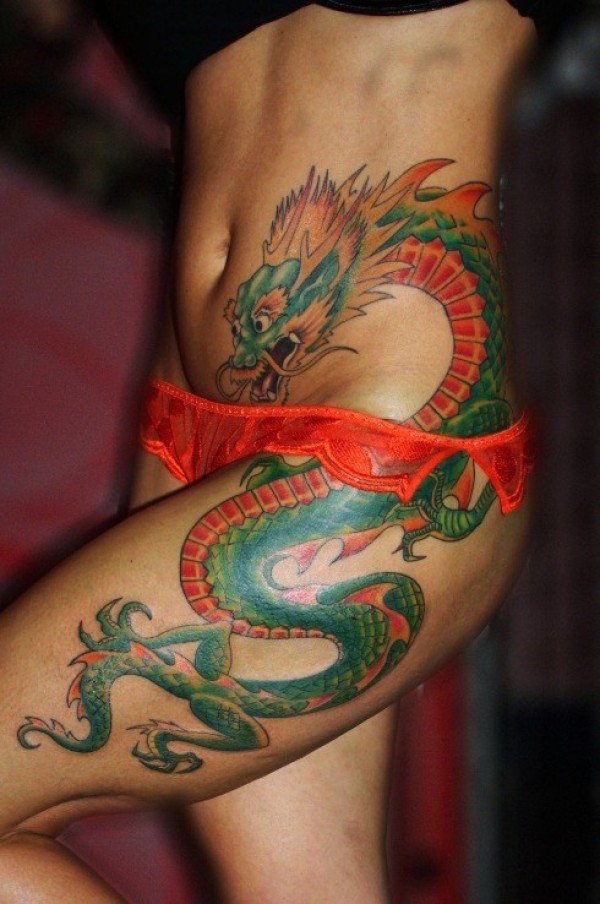 女生大腿侧肋绿色的龙纹身图案