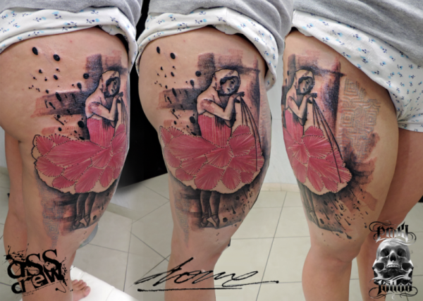 大腿漂亮的彩色舞女花礼服与十字架纹身图案