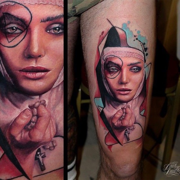 写实逼真的彩色护士肖像与十字架纹身图案