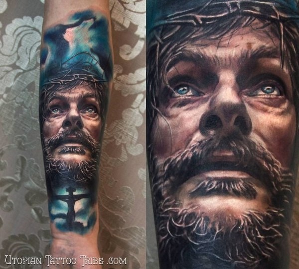 new school彩色耶稣肖像与十字架纹身图案
