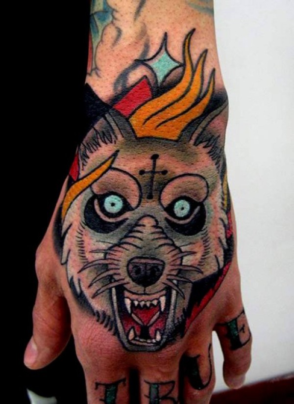 手背school彩色邪恶狼头十字架和火焰纹身图案