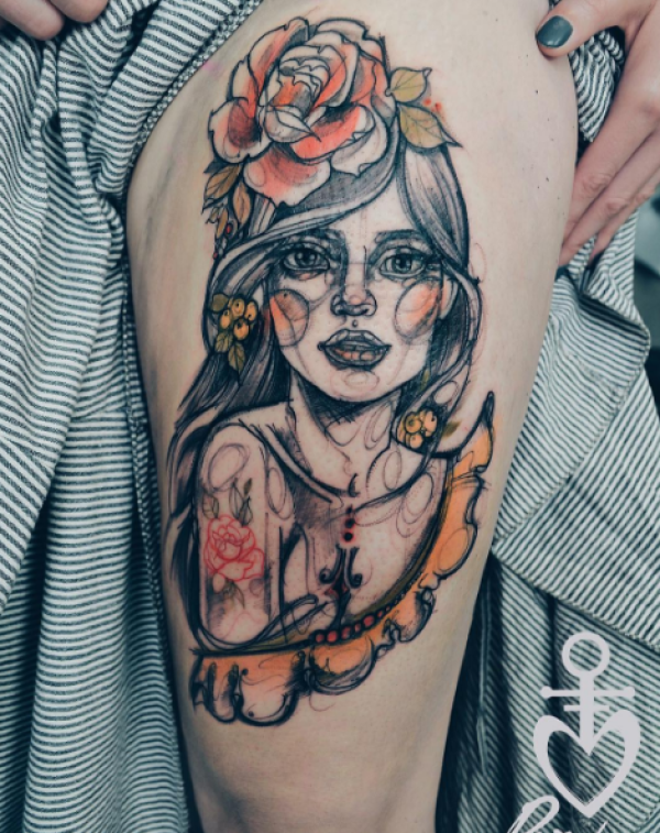 大腿彩色可爱女生与玫瑰和十字架纹身图案