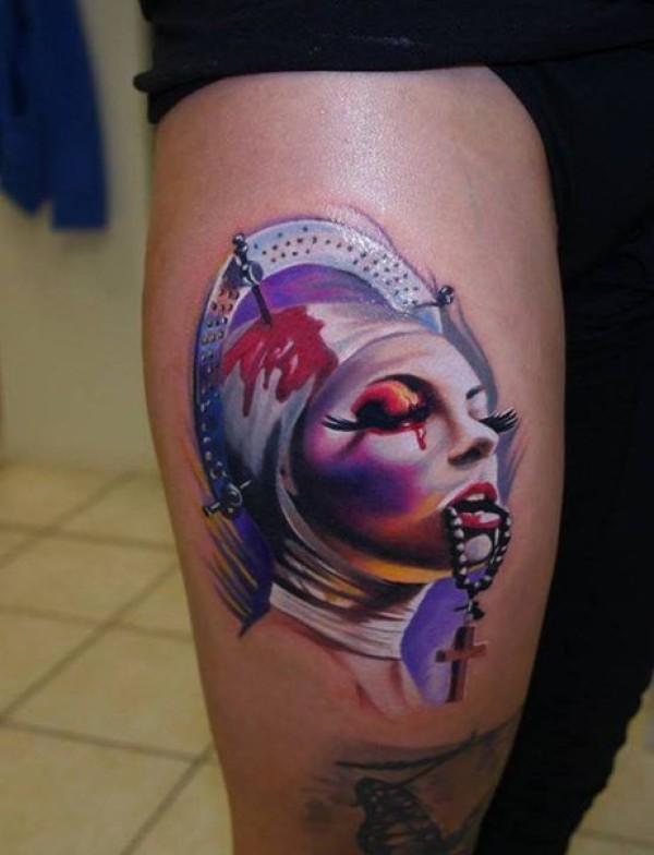 大腿new school彩色血腥肖像和十字架纹身图案