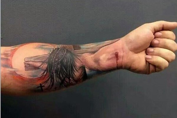 手臂彩色宗教十字架耶稣纹身图案