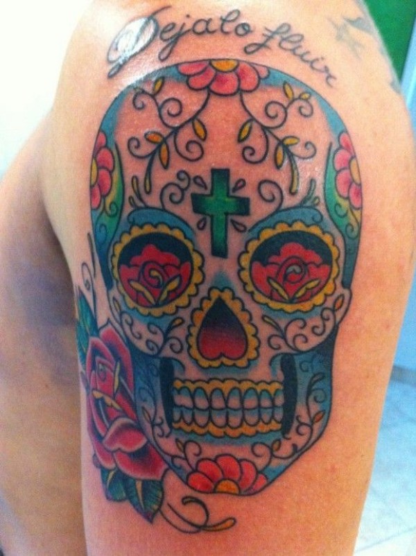墨西哥糖果色骷髅和绿色十字架纹身图案