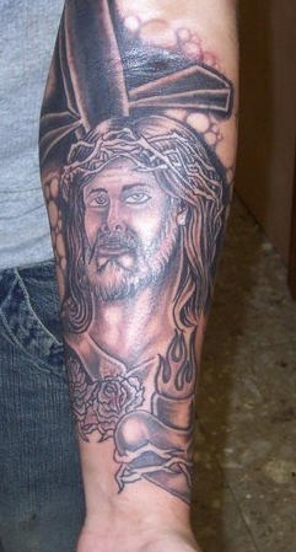 小臂十字架和耶稣玫瑰纹身图案