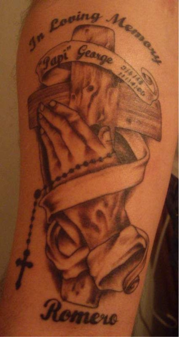 木十字架与祈祷之手纪念纹身图案