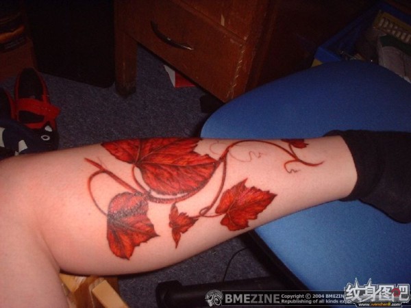 腿部的红枫叶纹身